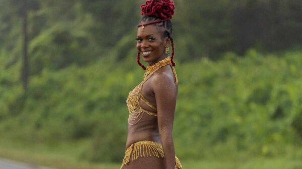Para a ocasião especial, Tatiana apostou no dourado, remetendo ao sol e ao “amanhecer na ilha”, alusão também à posição de desfile da escola, que fechará a primeira noite dos desfiles da Série Ouro.
